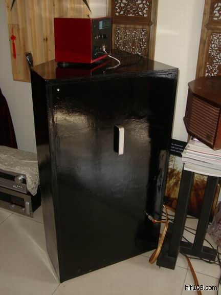 低音箱体的尺寸是 107cm高*85cm宽(前面板宽50cm)*60cm深 所有障板厚度1英寸,大音压下岿然不动。算上静电高音的系统总高为125cm