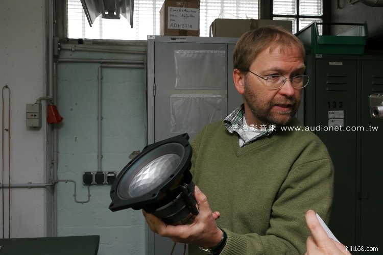 首先,Thomas将输出功率调到七瓦,单体已经出现明显活塞运动,这种输出功率其实就是我们一般在家聆听音乐时会用到的扩大机功率,也是一般喇叭工厂测试单体时惯常使用的功率。 对一般喇叭厂而言,用这种功率测试过关之后,就代表喇叭品质合格。 但是Thomas告诉我们,这种程度的测试对ELAC单体来说只是小事一桩,根本没有任何意义,完全无法测出喇叭在极限重播状况下会发生什么事。