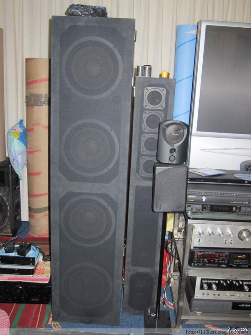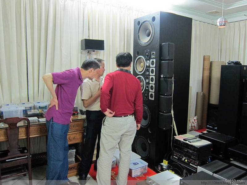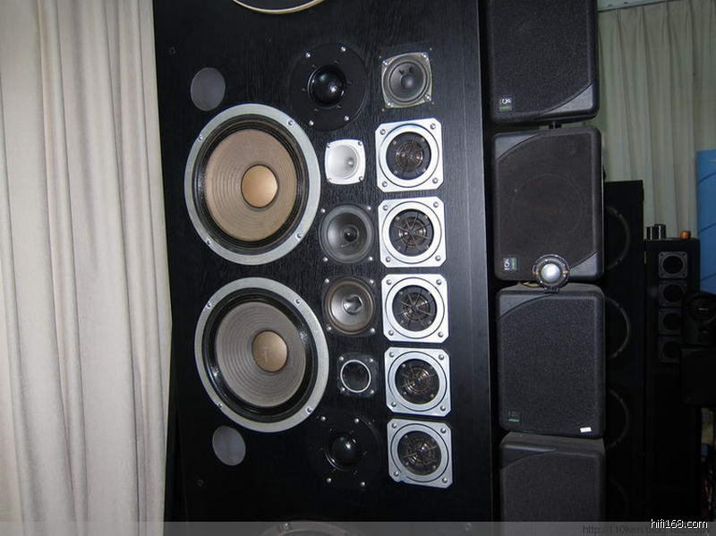 礼哥的这个巨型DIY音箱肯定是我见过的最高大的音箱,每个音箱有2个超高音、5个高音、2个球面中音、3个中音、2个中低音、3个低音共17个喇叭单元,礼哥跟我们介绍道:这些喇叭单元除两个惠威球面中音外其余都是从广州、南海大沥及本地的二手市场购回的日本音箱拆机单元,其中最贵的低音单元也就一百多元一只,而那些中、高音单元也就四、五十元一只,都不是什么贵价货,但都是经礼哥试听和精心挑选回来的。