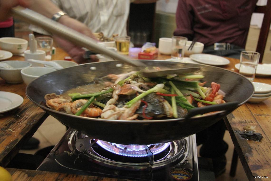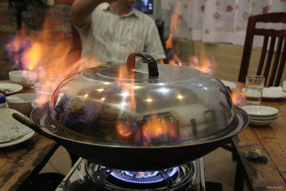 第二道是海鲜醉大鱼,这道菜要多等一些时间,加热后要放一支半米酒煮沸,然后在盖子边点燃等里面的酒精燃烧完才进食,火光雄雄十分壮观。