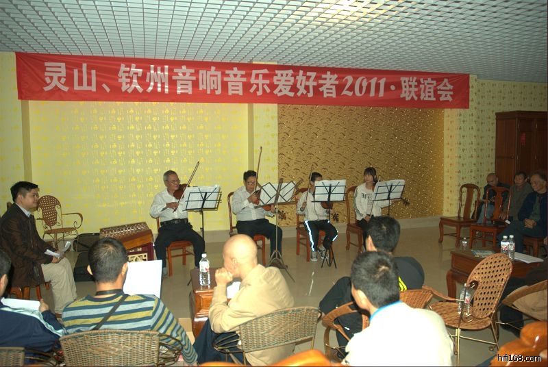 经灵山,钦州两地发烧协会的几个月的周密筹划工作,“灵山音响音乐发烧友协会第五届大会”暨“灵山.钦州音响音乐爱好者2011.联谊”,在灵山县大世界如期举行,当天有来自钦州.灵山县.浦北县70多名发烧友参加了本次盛会,特别是首府南宁市大发烧友肥仔也应邀冒雨二百多公里前来参加了本次盛会并指导会议工作,本次盛主要主要内容有二个—乐队的现场演奏和多款开盘机的视听。