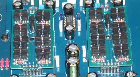全机共采用138颗进口名牌三极管。其中电流传输模块和缓冲部分共96颗,配对精度在千分之五以下,配对成功率不到百分之二十,成本极高,(图2为电流传输模块)。7组由分立件制作的并联电源稳压分别对数字和电流传输模块等供电。PMD100数字滤波芯片,DRI9001数字接收芯片,PCM1702解码芯片。(图3为并联电源稳压。)