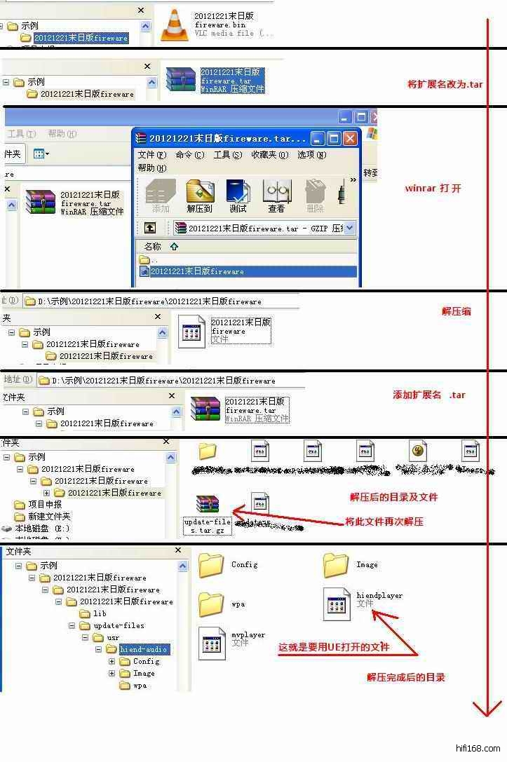 我们就开始想办法把固件解包。这一过程可能比较繁琐,也需要碰运气,折腾半天,有可能一无所获,实在解不开的话,只能从自己的RP方面找原因了。固件大家可以到有关高清播放器官网去下载官方提供的固件升级包,一般厂家的固件都是以压缩包的形式提供的。下载以后,用Winrar之类的解压工具解压到任意目录即可。固件压缩包中一般会有一个或几个文件,包括升级用固件、升级说明甚至是此版本固件有哪些改进等等。我们关心的就是升级用固件。我从某网站下载了升级用固件包,文件名:“20121221末日版fireware.rar”,用Winrar解压缩到20121221末日版fireware目录后,进入目录,目录中只有一个名为:“20121221末日版 update_firmware.bin”的文件,这个文件是要放在U盘上由播放机的系统软件来读取并写入播放机来完成升级的。前面已经提到Linux下常用的封包格式,我们来碰碰运气,先把扩展名bin改成tar试试,文件扩展名改完后文件图标就变了,不要管他,双击试试Winrar能否打开,运气还不错,Winrar成功把文件打开了,打开一看,包里又只有一个文件:20121221末日版 update_firmware,不去管他,直接解压,解压后,给这个文件再加上个扩展名:.tar,继续用Winrar解压,解压后的目录里终于出现多个文件了,其中有一个文件是压缩格式,文件名为:update-files.tar.gz,再次将其解压缩,解压缩后,包中有个usr目录,目录中包含多个目录和文件。至此,固件解包完成了。