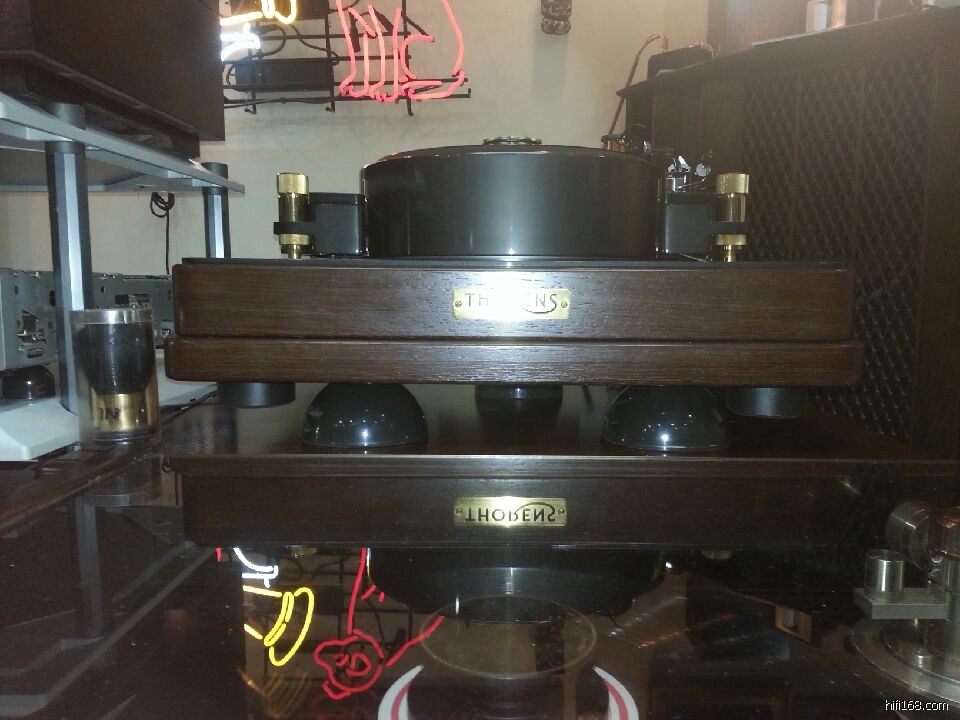 陈总再向大家介绍"德恒之声"的航母脚垫在LP机器下面!播放是一张收藏的LP片源,卡拉扬指挥“蓝色多瑙河“圆舞曲。有脚垫与无脚垫素质完全不一样,用上后音乐的出现是很有思维,听到号声出现,一位听者激动地说: 没脚垫号声的出现,“迷雾“已经没了,垫钉后迷雾几乎是在慢慢散去。这位朋友对我说:这台LP机的老板,听到你的钉脚垫在他机下,出现的音声要向你恭拜。呵呵,当然不是这样说,机的本身素养很高,钉脚则是提供了一个稳定的平台而己!脚垫本身不会发声!对于整个曲子,垫钉后的节奏感等等不多介绍了。有兴趣的朋友可以去陈总店听听!