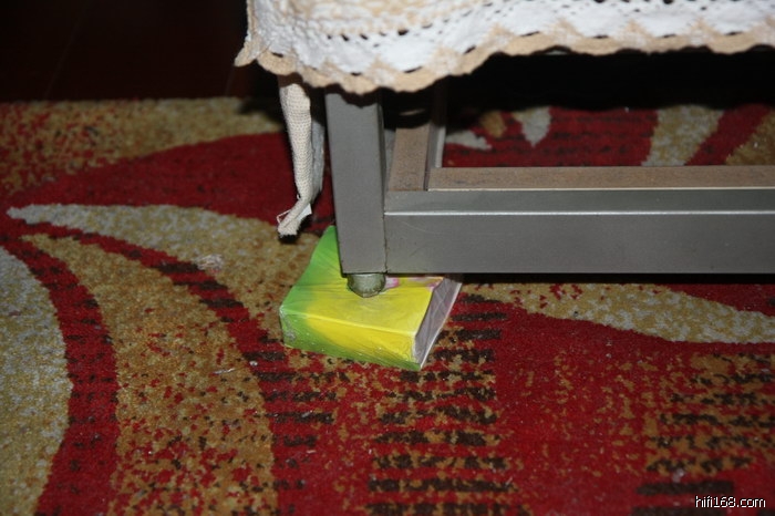 2、把音箱顶部往左边一推,扶住,用脚把普通厚度的随手贴顶到底板下;然后同样的办法把右边也垫起来。请注意随手贴摆放的前后位置,使之处于重心位置,不会前后倒。