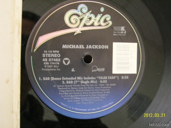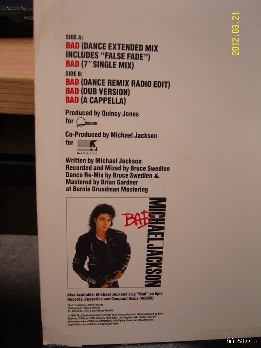 昨晚听了这一张,重新回到高中时代.MJ这个BAD专辑,是我拥有的第一张MJ专辑,中唱引进版卡带.当年简直是刘姥姥进大观园,原来POP还可以是这样的.下面贴图的这张是,单曲MIX,一首BAD,5个版本,很过瘾.尤其是A面第二首,很少的乐队伴奏,更加突出了MJ演唱的功力,太过瘾了.音效好的不能再好了,即使现代的制作,也完全没有可能超越这位曾经的天皇巨星的乐队和录音班底.假如阁下的黑胶调整到位,不闻歌起舞才怪!!!