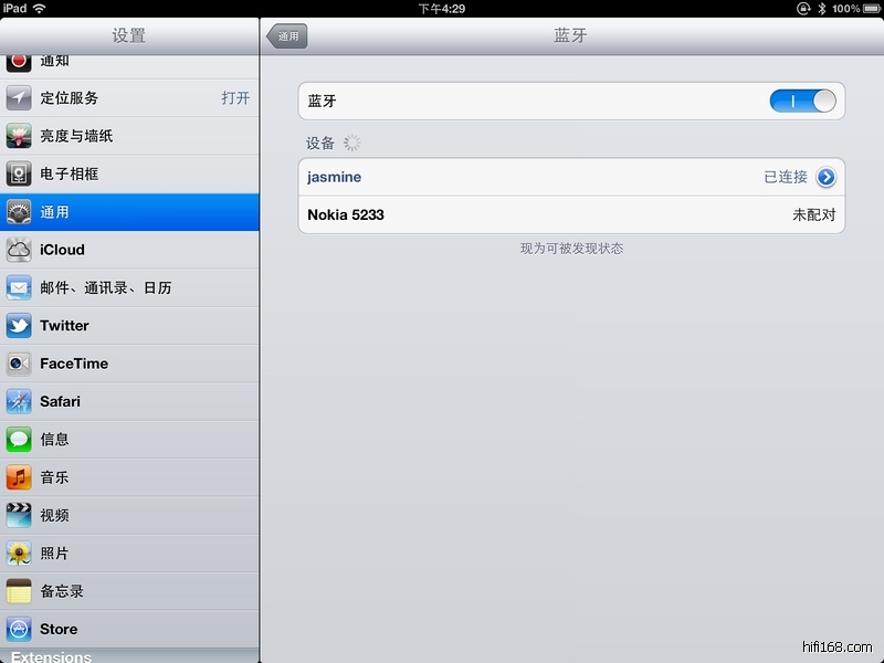先来看看ipad的设置界面,在设置里打开蓝牙,出现jasmine后匹配即可