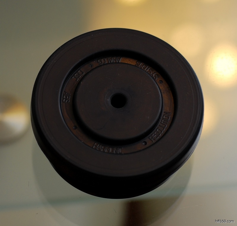 先说说声音以外的,HRS的碟镇上层是金属,底部包括中心圆内是类似橡胶的材质,这种设计有个很有意思的功效,就是吸附,每次把碟镇拿起来都听到“波”的一声,因为中心是橡胶的,而且大小刚好,放下镇的时候会把圆心内的空气挤出,变成类似真空状态,碟镇除了自身的重量外还利用真空把力度保持住,使得谐振保持一种特殊的平衡。