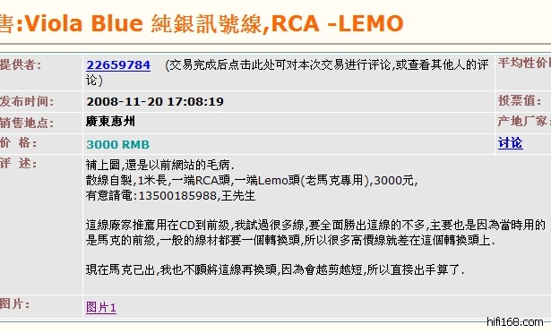 voila纯银信号线原是香港全套cello玩家留下,共2对,我和朋友各拿了一对,我这对加装了卡大师旗舰镀银和镀佬RCA头,声音饱满又华丽,对比线皇纯银线差在声场和密度,总体有6-7成线皇水准。该线日本上市价格是180000日元,线长一米,现在预出价格2000元,可以试听收货,欢迎对比5000+纯银线,QQ 34237188,13566539274
