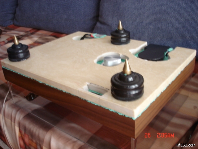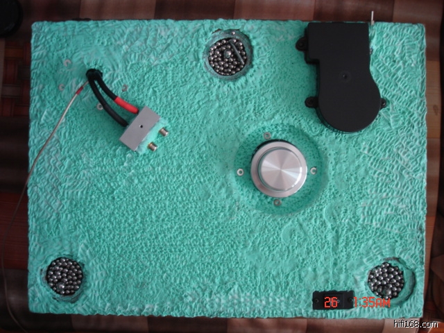 想继续挖掘这款转盘的潜力,量身做了一块人造大理石板与LP台板粘在一起,粘合剂还是泥胶,哈哈试试三文治结构的变化!!