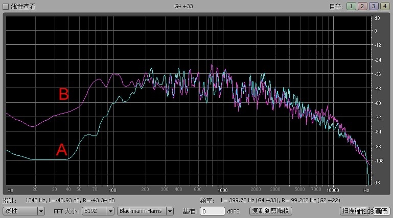 不谈器材,就两段录音来做个频谱图,A段200赫兹以下的低频明显比B段低几十个分贝,非常明显的频率失真,不知道说A好听的是什么耳朵。