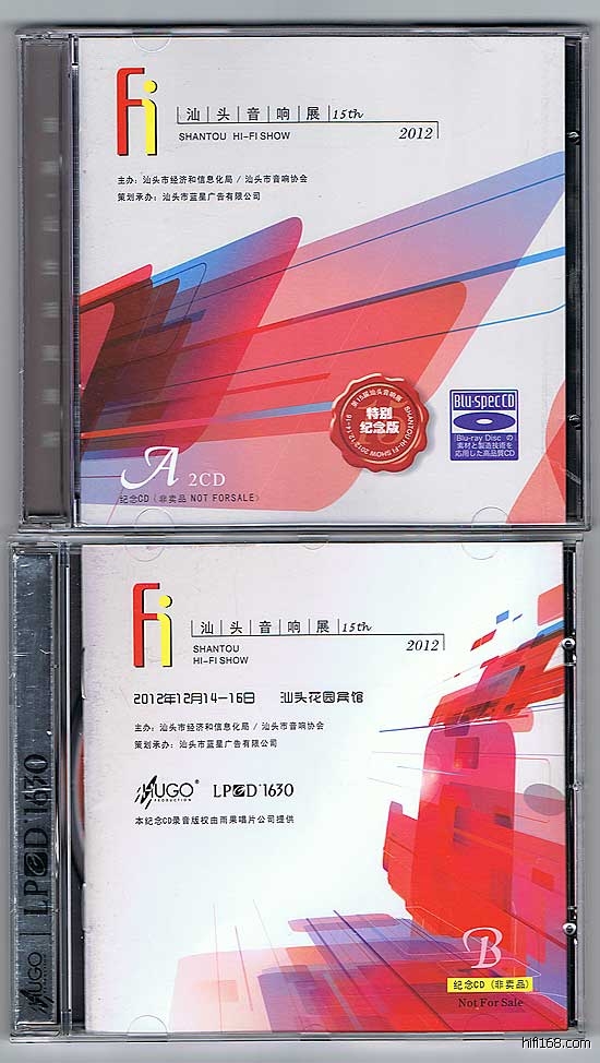 2012汕头音响展赠碟,一套两款,LPCD1630和蓝光CD,分别选自雨果、ABC、瑞鸣、达人艺典等等唱片公司,蓝光CD里面有两张唱片,所以是一套两款三碟,汕头音响展组委会共送出10套给168的网友。