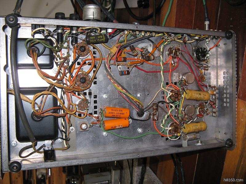 其中的一台600V之后的串联供电的电解一路坏了,所以电压上不去。我看了原机是刻字的纸筒大D, 400V 30U,手上没有合适的,只有一个纸筒的450V40U大D,年代不清,估计是50S或60S的,声音应该会类试,但是外观会破坏。而且两个声道可能会不一样。后来我只好用一对80S的Mollary FP替代,把两个声道都换了。使用电容串联时,如果容量不一致,每个电解承受的电压是不同的。一般设计都用两个100K-1000K的电阻均压。我担心这些古董随时会有电解干涸容量变化,所以把原机的分压电阻1MOHM两个改为390K5W的。不过这是辅助的,每个电解的容量大小才是决定性的,所以如果串联的两个电解容量相差太大,是不行的,容量大的耐压就高,如果超过额定的,就危险,考虑到各种因素,一般要有20%的余量。