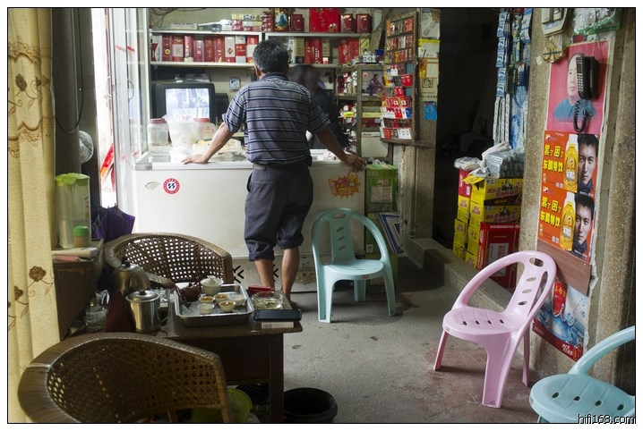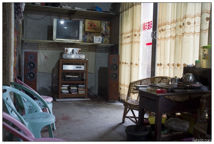摆放音响的空间,很窄,宽度大概只有2米,但很长。他很少大音量听,低频就没有太大的不便。有一桌小茶几,常有乡亲围坐,其中有一位村中二胡高手,夸他的音响好听。会不会因为这套音响,他的生意比较好呢?从一早开店,到晚上12点,这套音响就一直在歌唱。但他的村,没有其他人玩音响的。他会不会感到孤独呢?