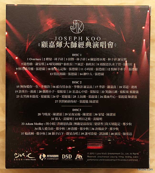 爱我音乐唱片公司出版了这次演唱会的现场录音唱片,才有发烧的AQCD制作方式,一套3张唱片,一共40首歌曲,一次听尽大师的经典金曲。