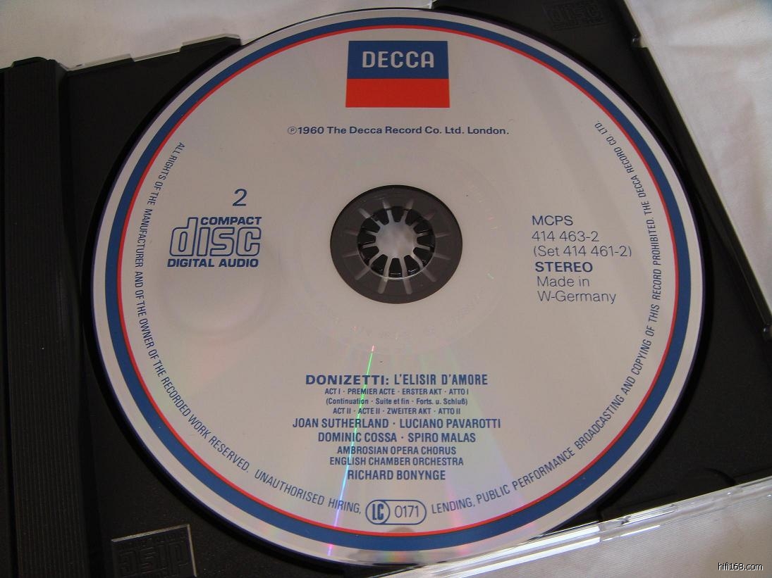 春节在家把玩中意CD,偶然发现06年在金海印李源实体店里买的萨瑟兰、帕瓦罗蒂所唱《爱的甘醇》中,印刷碟面竟然把该碟的首发时间印成1960年,然而那时萨瑟兰刚出名、帕瓦罗蒂还在练嗓呢。封底明确标明首发时间是1971年。搞不明白这1960是什么意思?请李大侠指点迷津,并建议拥有此碟的同好也拿出来看看,是否有相同情况。具体见下图,分别是纸盒封面、塑料盒封面及封底、两张碟子。