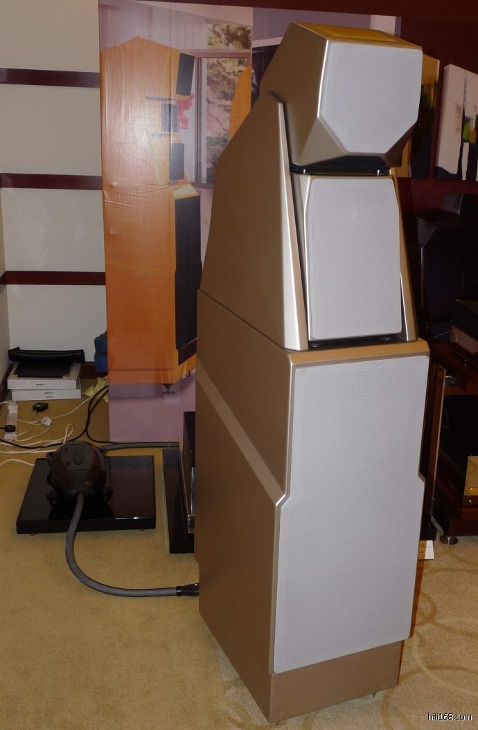 外观威武无比的MAXX3喇叭采用三音路五单元低音反射式设计。五个单元分别是1寸钛高音1个,7寸纸碳纤维中音2个,11寸与13寸W振膜低音单体各一支,频响20Hz-21kHz(+0/-3dB),阻抗4欧姆,灵敏度91dB,净重193公斤。既然提起WilsonAudio威信的喇叭,就让我们来看看这家著名扬声器制造商的历史吧。威信成立于1973年,定位于HIEND喇叭的制造。在推出喇叭前,Wilson Audio老板Dave Wilson推出的其实是LP唱盘。WilsonAudio的现役旗舰喇叭是AlexandriaX2取代,再下一级就是本次展会中的MAXXSeries 3(第三代)。这个喇叭采用将高中低音箱体分开建议独立的箱体的设计。7寸纸纤碳纤混合中音单体是与Scanspeak合作开发。 1寸高音单元向法国劲浪Focal购买,但经过驱动磁体的改良。11寸与13寸低音单体也是向法国劲浪Focal购买的,再加以改造,增加磁铁的强度。