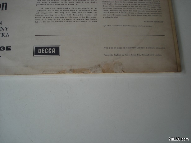[size=5]932)BRAHMS:第一钢琴协奏曲。CURZON演奏钢琴。SZELL指挥LSO,WILKINSON录制于KINGSWAY HALL。ED2宽标带沟第二版。封套背面有磨损(见图),唱片第二面有一点点极微弱和内套擦痕。[/size]