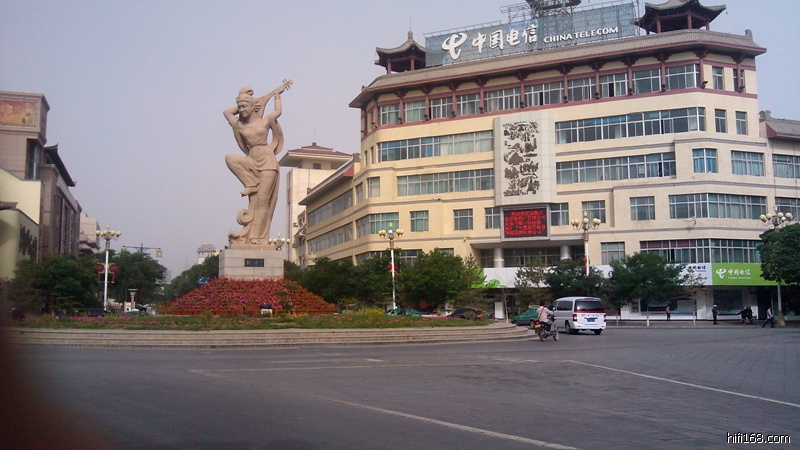 早上经过敦煌地标,飞天倒弹琵琶。(在莫高窟,看着倒弹琵琶壁画,很佩服现代人的想象力。)