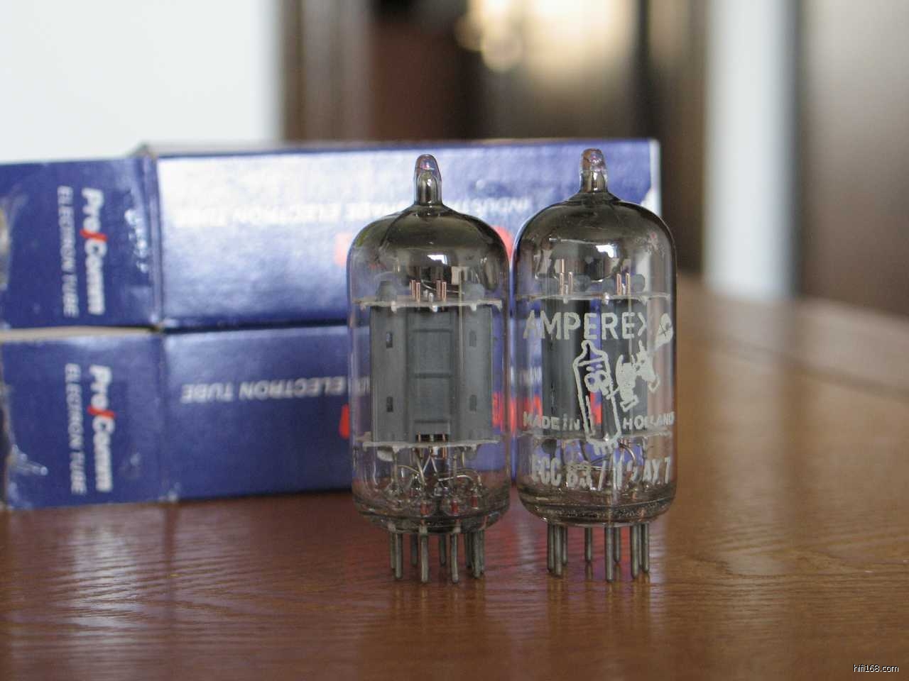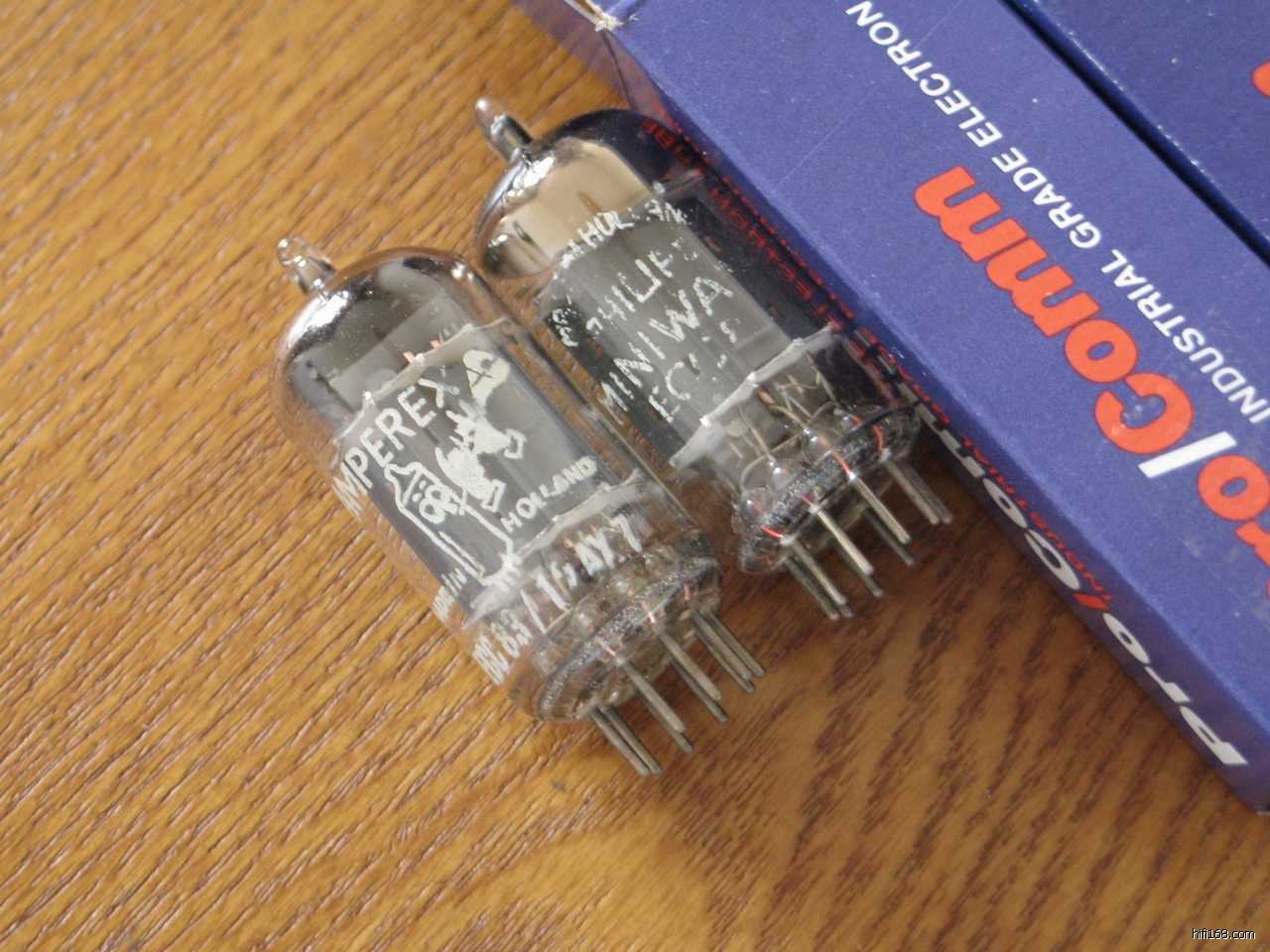 56年荷兰产ECC83/12AX7,十字顶,铜柱,17MM长屏斜D环,产自同一条生产线,结构完全一致,一支打飞利浦,一支吹喇叭,成色新净见图。测试如新,配对在3%以内。一对价格2580元
