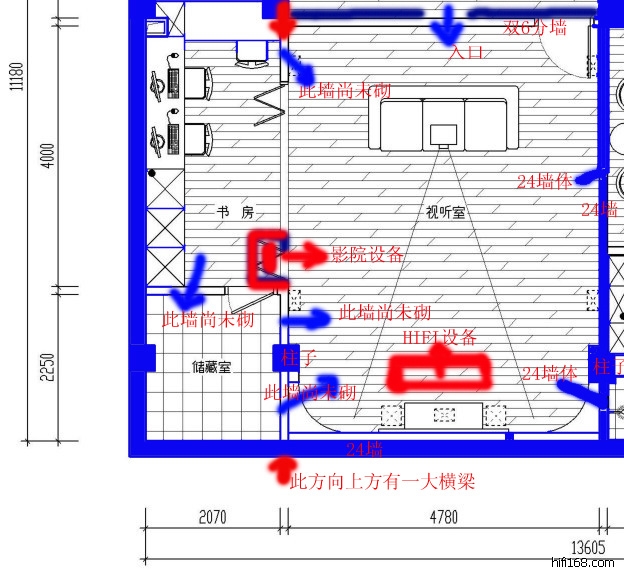 就是因为这条梁不能打掉,所以听音室只能按照目前这个方向摆位。