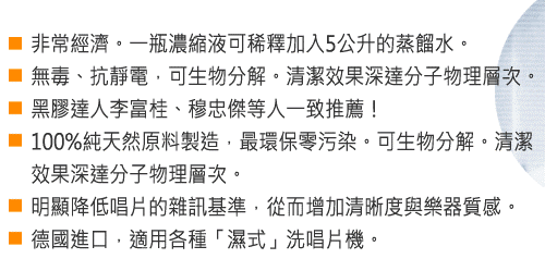 [font=Tahoma,]这个洗碟水是浓缩液,需要配备一个小喷壶,使用非常方便。最少可以洗超过500张唱片,效果非常好。(如果是洗液手洗加蒸馏水过水,估计可以洗1500张)[/font]
