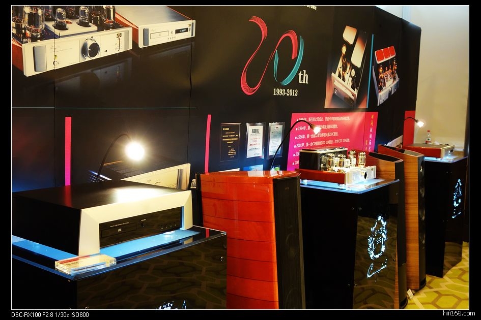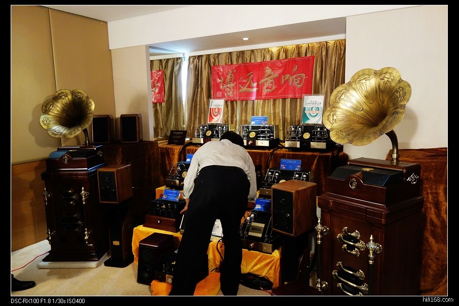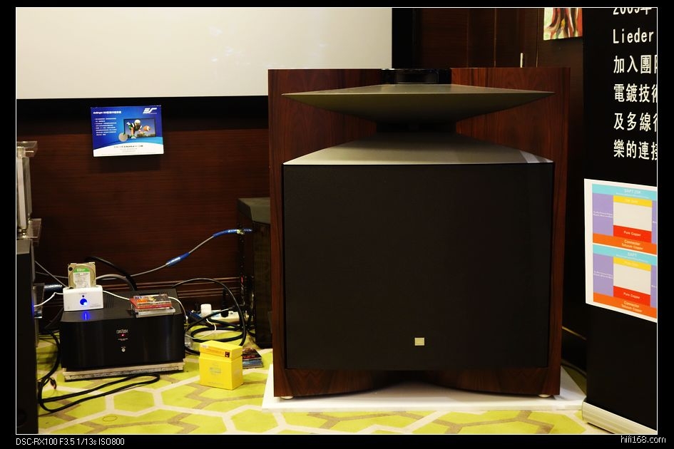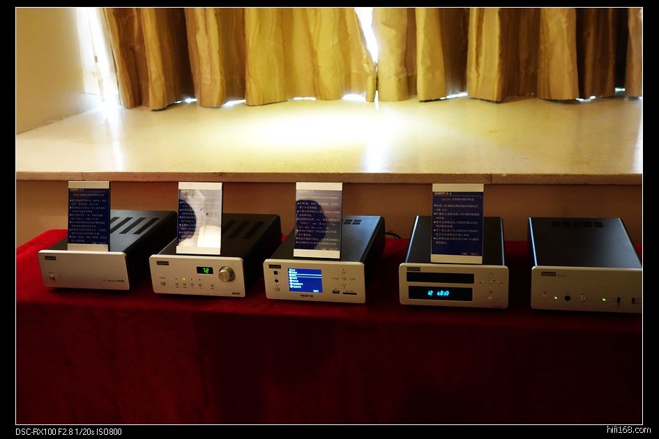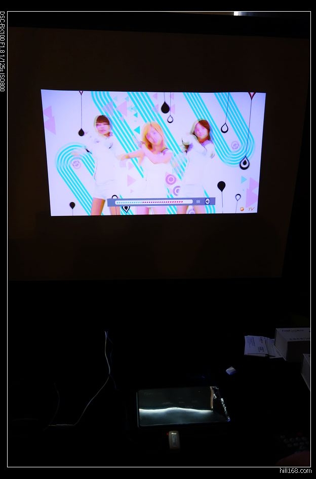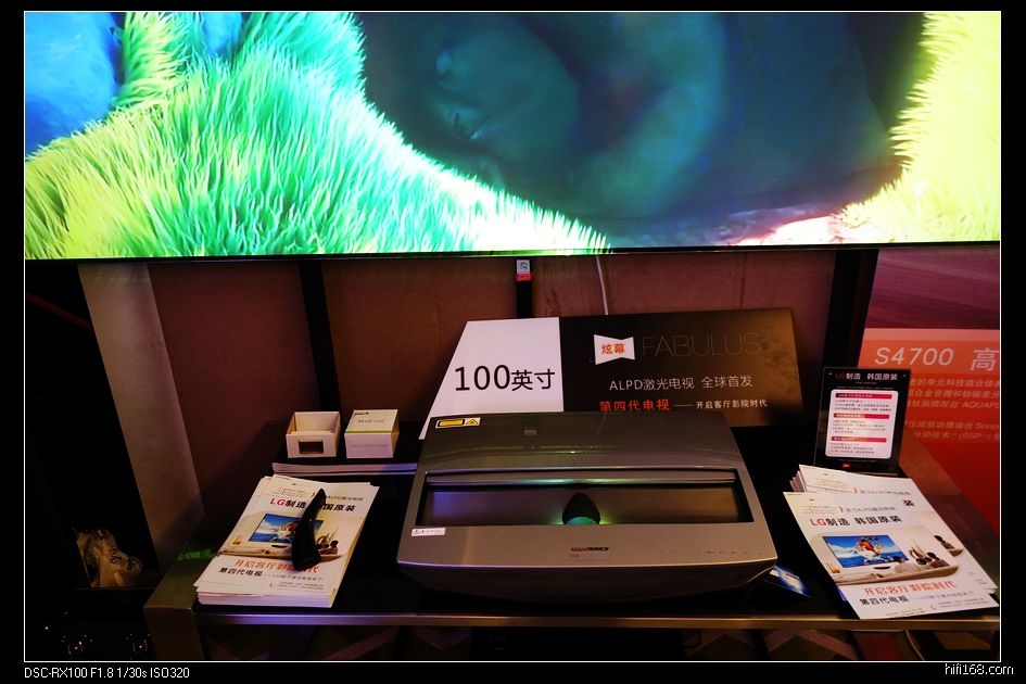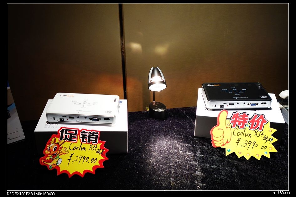 这也是一个小展室,桌面放着几个入HITV机顶盒大小的小盒子,背面朝外,很多各种接口,自带扬声器,标价2K+至3K+,一时没搞清楚是啥。把机器拿过来看到有一个大眼睛,原来是便携式投影机,确实很小巧,曾经听说过,今天算是见到了实物。厂家介绍说理论上可以投到240寸,分辨率为720P。厂家演示放了一段海底世界的3D片,带上3D眼镜看,3D效果非常棒,如果分辨率在高一些,就这价格,还真是一个不错的选择。