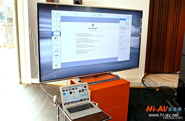 Devialet以一部Mac Book Pro筆記型電腦做為數位音樂訊源,後方的超大尺寸電視則做為簡報看板,讓來賓清楚瞭解本機的特色。
