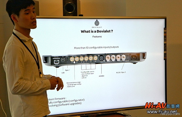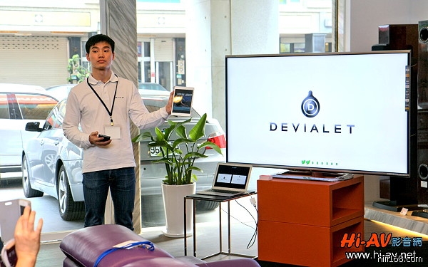 發表會特別邀請Devialet亞洲區行銷經理楊耀韓先生專程由上海來台,為大家解說Devialet的先進技術特色,他手上正拿著iPad mini平板電腦與Android手機,為大家展示透過專屬APP播放音樂及操控Devialet的便利性。法國Devialet在全球總共有近六十位員工,但工程師數量就有四十位,而且其中一半是軟體工程師,Devialet對於研發及軟體工程投入的重視程度,在Hi-End音響業界可說絕無僅有。
