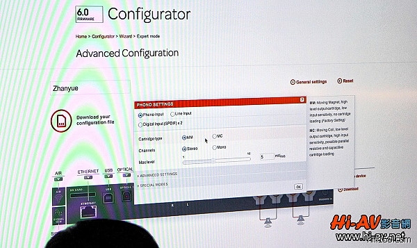 很難想像,外觀如此纖薄、造型如此先進的Devialet竟然也內藏MC及MM唱頭放大電路,而且還可透過這個電腦操作頁面,輕鬆且精密地調整阻抗、靈敏度與RIAA曲線,比起其他品牌唱頭放大器必須用手撥動撥桿調整,Devialet顯然先進方便得多。