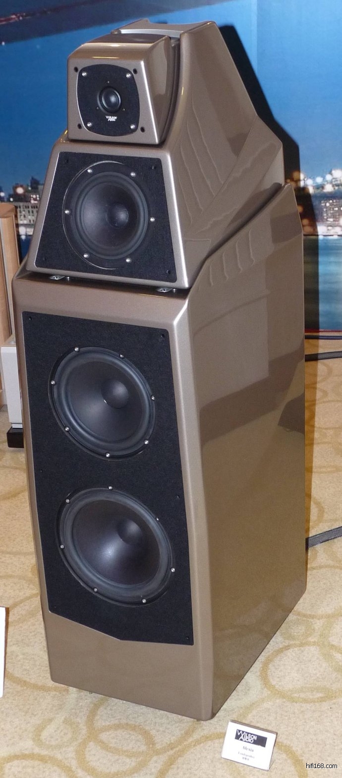 从下面的官方资料上,我们可以得到的重要信息是,这对美国威信WILSONAUDIO的ALEXIA喇叭的定位介于MAXX3与SASHA之间。研发时间达到2年!两个低音单元分别为8寸与10寸,采用软半球高音单元,设计者特别指出,铍单元,陶瓷单元,钻石单元存在音染问题,而现在采用的软半球高音音染更小,声音更加自然,箱体严格避震,重量高达117公斤每个。这个喇叭的美国定价为48500美金一对,按照今天的汇率,折合人民币30万元一对。