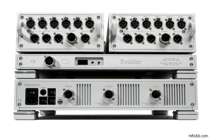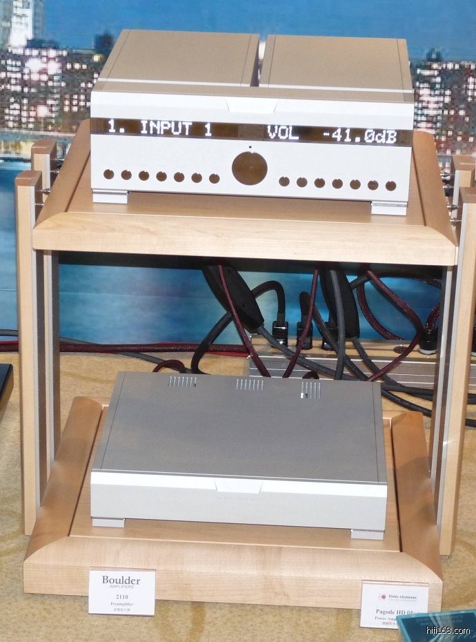 前后级为全套美国顶级品牌BOULDER的顶级设备。前级为2110(2010前级的升级替代品),就是你看到的下面的照片中的架子上面那台,下面的那台是为2110前级设计的2100供电装置,2110与2100组合成为顶级的一套前级放大器。想拥有这套前级吗?美国定价54000美元!折合人民币33.5万元!比这对喇叭还要贵!请记住一点,从展会情况而言,正说明永恒不变的真理,驱动喇叭的功放,不能比喇叭便宜,那样不会有好结果的!功放之重要,毋庸置疑!