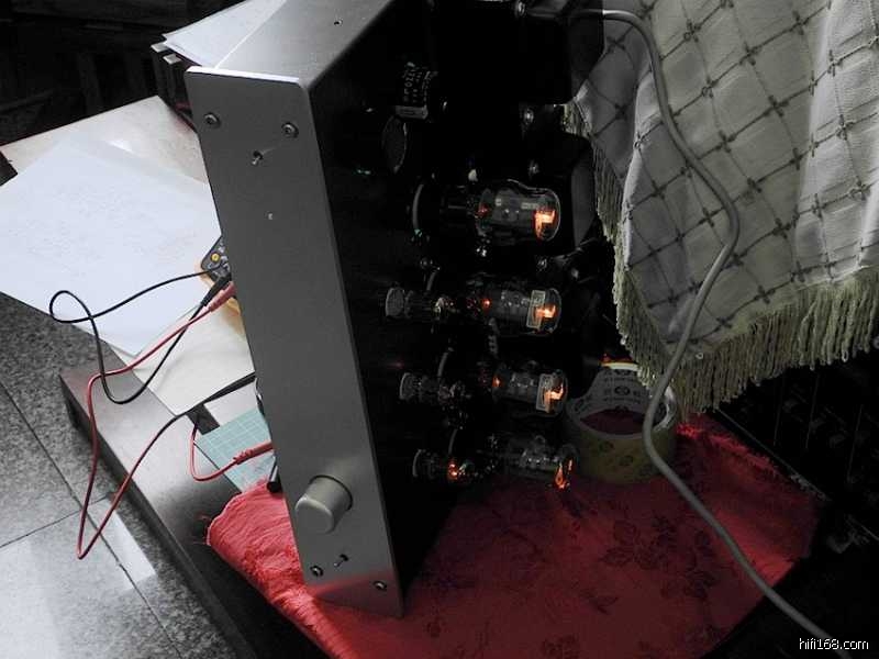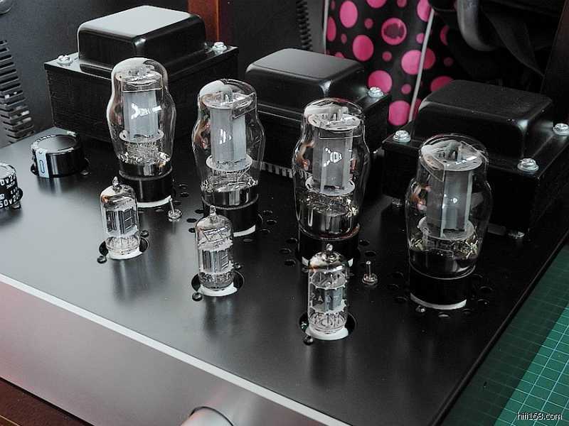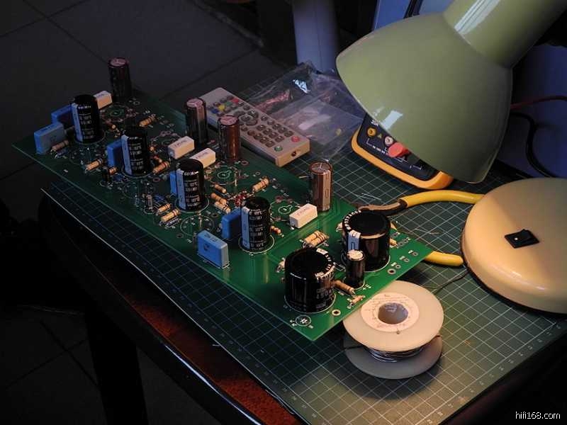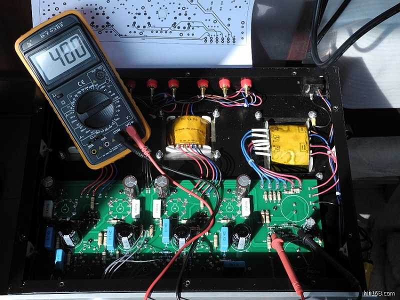 印板上的阻容器件焊接完毕之后,可以参照线路图认真核查一遍以防有误,借此机会亦分析一下整机的电路特点∶整机共采用了七只电子管(12Au7X3、6P3PX4),其中第一级电压放大级两声道共用一只双三极管12AU7,第二级的V2(V3)亦采用了12AU7来作长尾式倒相,具体来说V2(V3)的上端为激励管,下端为倒相管,此电路的特点是V1电压放大管的屏极与V2管上端的栅极直接耦合,从而构成长拖尾形式,因此输出信号具有相移失真小与频响范围宽的特点。V2(V3)管上端为共阴极形式,信号放大之后由屏极输出;V2(V3)下端则为共栅极方式,信号经阴极直耦输入,再由屏极输出,由于倒相级阴极加有较深的电流负反馈,故稳定性较好。