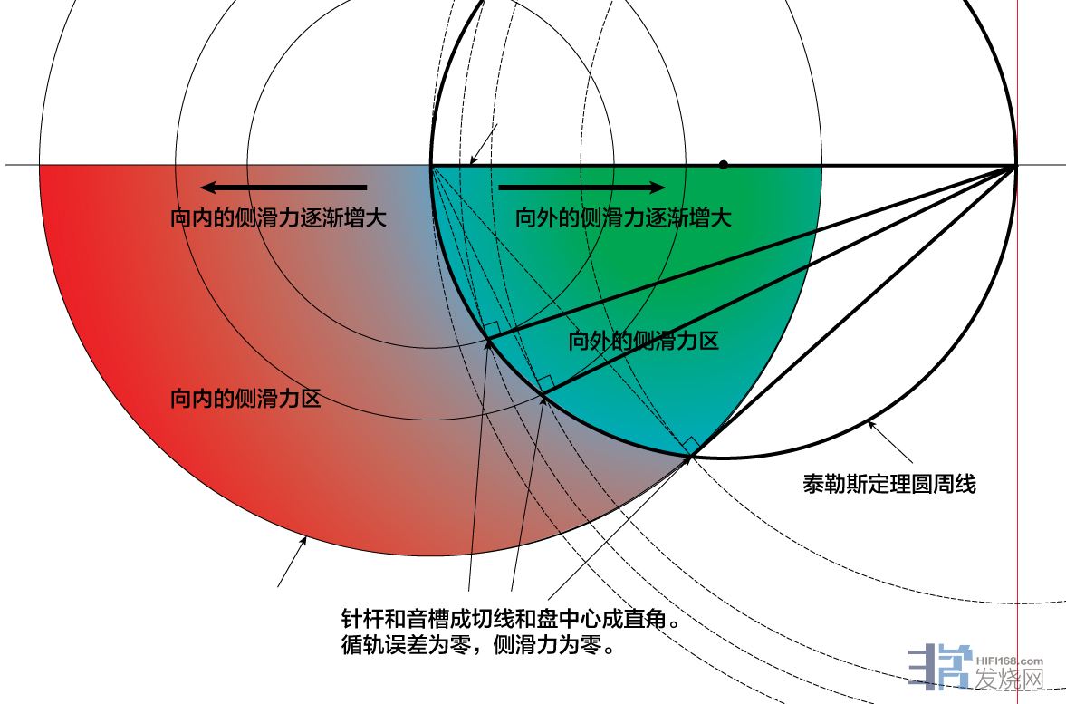 大家之所以看到他的内零点较贴近圆心,是因为唱片内圈部分寻迹移动的轨迹比较贴近红线,角度变化就较小,符合内圈优先的设计思路。