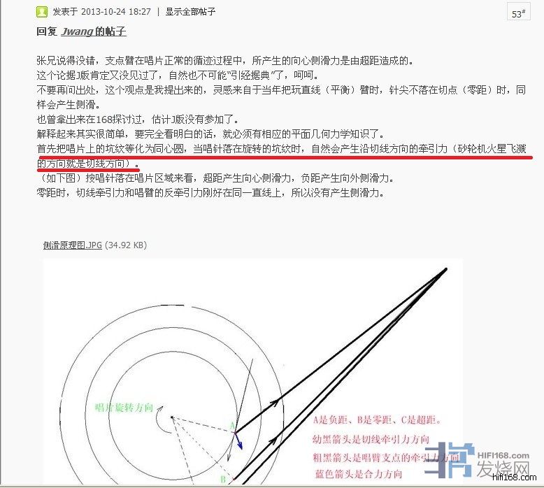 本来对于以超距运行的唱臂来说,这已经足够解释向心侧滑力的形成了。