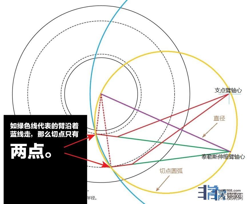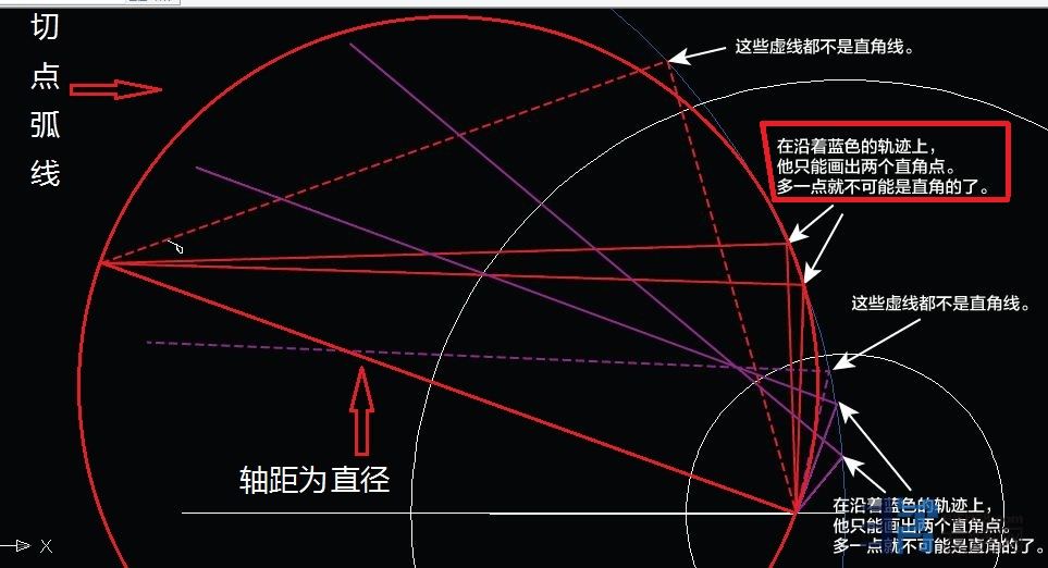我以轴距为直径画出了红色的切点圆弧,在这条圆弧上的圆周角都是90度,都和转盘相切,并且和蓝色的圆弧相交于那两个切线的点,这两个点仍在切点圆弧之上,没有超距!!!