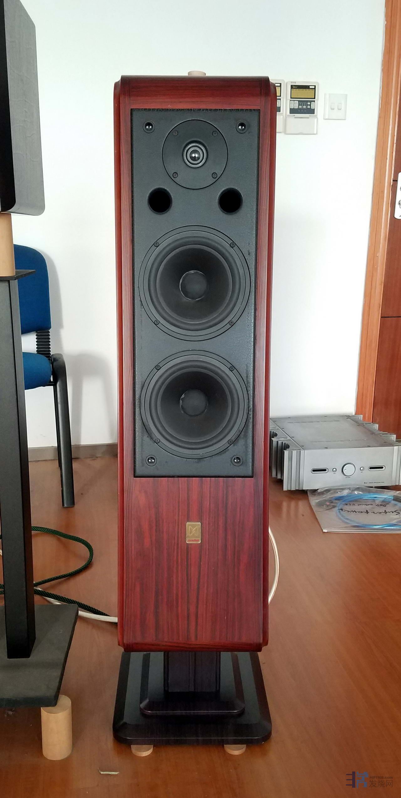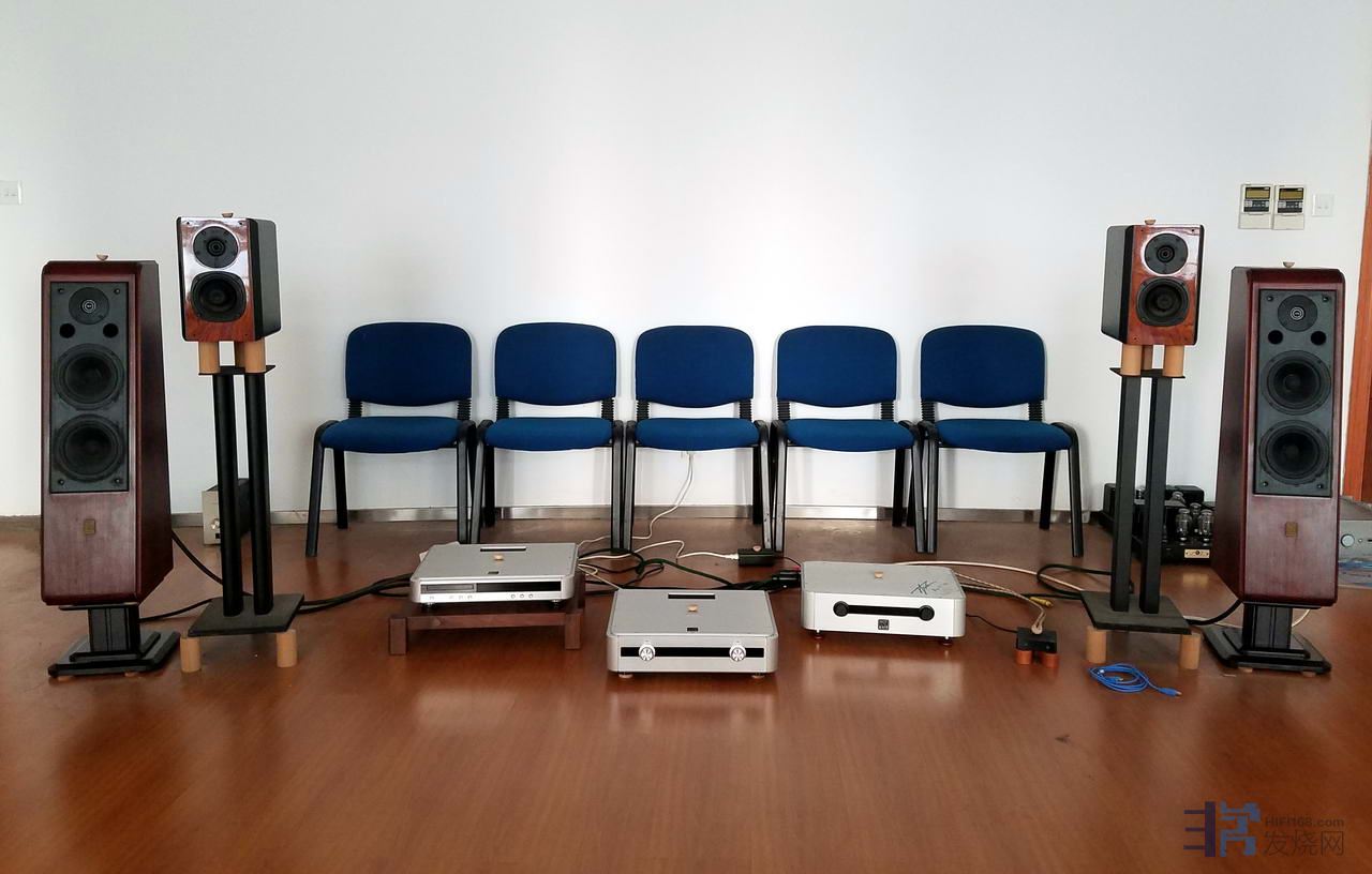 为了追求尽善尽美的音响效果,对听音环境作了微调,一是想尽量把书架音箱的高音调整到与听音者的耳朵在同一水平线上,这样声场的效果和结像的高度可以达到最佳。本来想换一对高一点的金属脚架,但是这样高度的脚架很难找,要定做,另外成本也比较高。考虑到最好声的还是实木,我就请认识的师傅用我自己感觉最好声的木头车制了12个圆木柱,在每个金属脚架的上下各放3个,两前一后。放上之后确实效果超赞,声场大小合适,歌手也“站”起来了,音响效果非常棒!