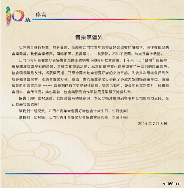 江门市青年音响爱好者协会成立十周年庆典活动通知:2014协会十周年庆祝活动继续得到各界友好单位的鼎力支持,延续协会周年庆祝活动的盛会,再现全国烧友友谊,团结,相聚的声势,现已基本确定活动安排如下:活动地点:江门市银晶国际酒店,7月5日10:00为开幕式及展览日,7月6日下午14:00—17:30为全国各地发烧友聚会,17:30-18:00拍合影照,18:30--20:00聚餐,20:00—22:00庆祝晚会。参加活动联系方式:广州地区请联系方老板,电话:34263812  13902241199,其他地区:请联系当地的热心烧友,江门地区:叶先生 13427230809。参加活动聚餐费用:按人头计算每人150.00元(含晚餐,晚会,送协会纪念CD一张)。这次盛会活动内容非常精彩,有雨果唱片易有伍主讲靓唱片,张春一主讲发烧唱片制作,小东主讲邓丽君极品黑胶收藏,著名演奏家马骁现场演奏古琴,实力派歌手王闻现场演唱,还有神秘嘉宾表演等等。活动奖品丰富,期待大家的积极参与,看看大奖这次花落谁家!