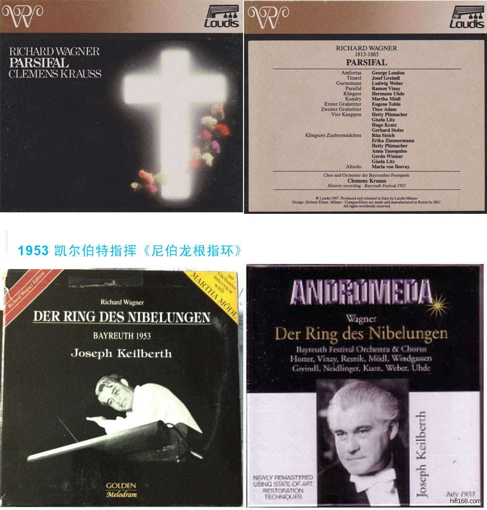 1952-195419521952 卡拉扬指挥《特里斯坦与依索尔德》 July 23, Tristan und Isolde - Mödl, Malaniuk, Vinay, Hotter, Weber, Uhde – Karajan issued on CD by Orfeo on C603033D and by Walhall on WLCD0001 and by Urania on URN22365 Aug 1, Parsifal - Mödl, Windgassen, London, Weber, Uhde, Böhme – Knappertsbusch - issued on CD by Golden Melodram GM 1.0051 and by Archipel on ARPCD01121952 凯尔伯特指挥《尼伯龙根指环》