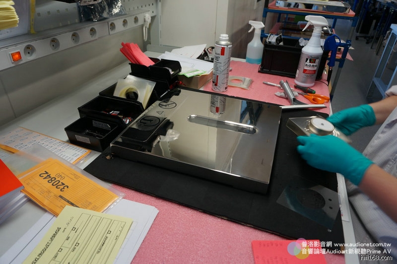 工作檯,一個階段組裝完成,就推到下一站,完全不必用手拿,避免弄髒機器。