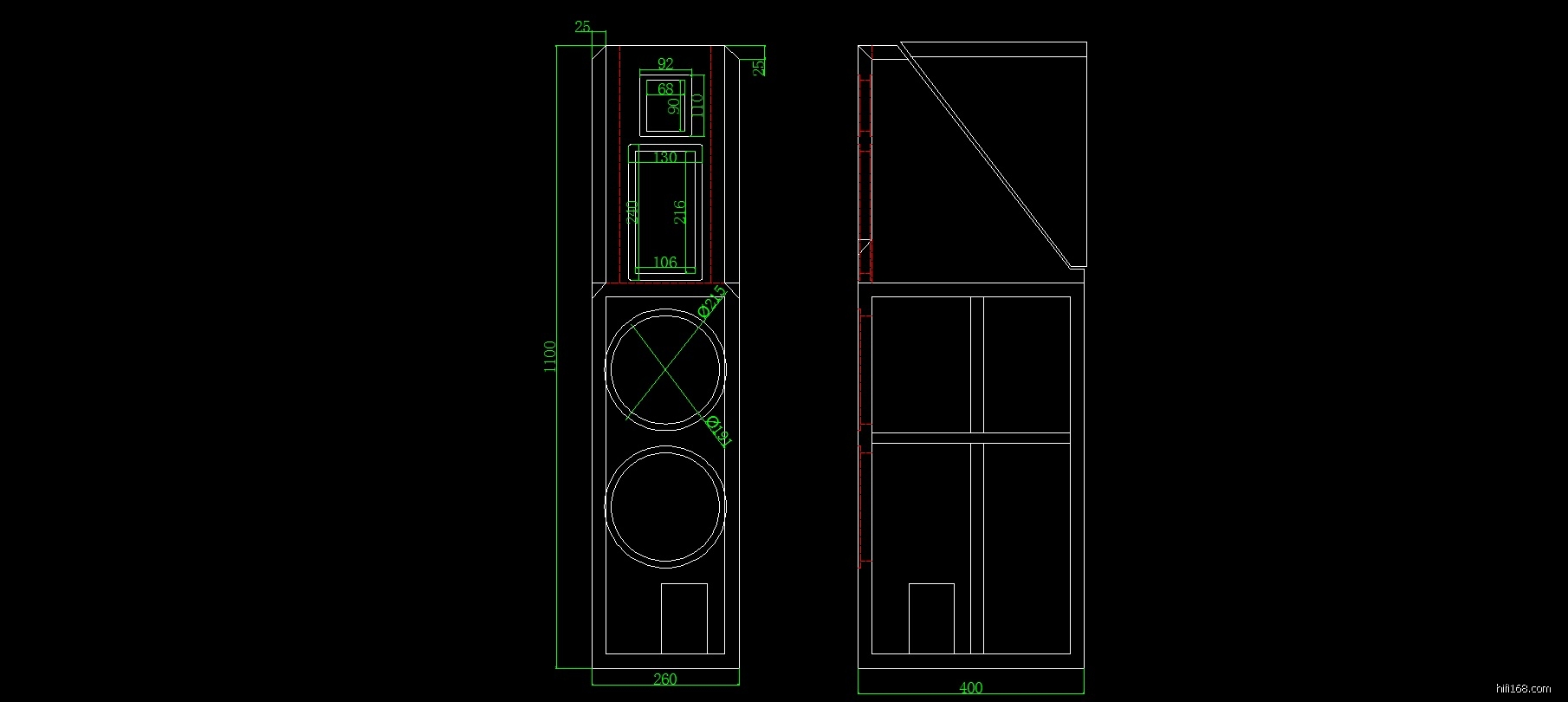 单元选定了,箱体也同步设计,我们决定采用高、中音开放式双向 + 倒相低音设计: