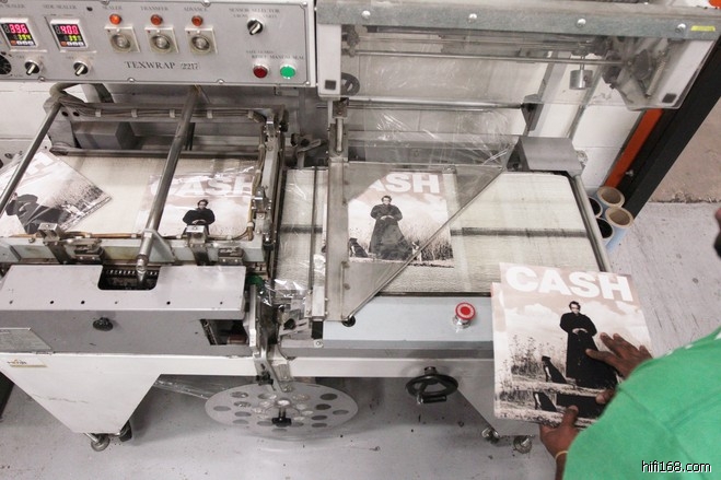 另一名工人希尔(Josh Hill)将唱片放上收缩膜包装传送带。