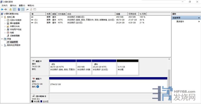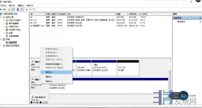 2. 右键点击“我的电脑”图标——管理——磁盘管理,在音乐磁盘信息的左侧部分有联机字样,点击鼠标右键——脱机,即为安全退出电脑系统。(如下图)