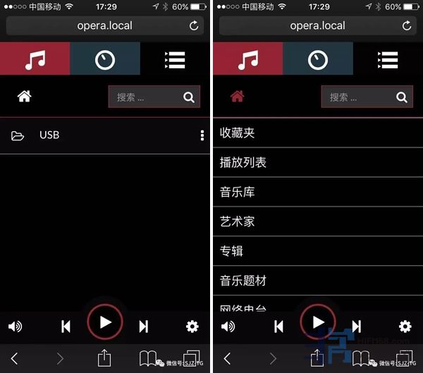使用上也很简单,手机或电脑和X5 pro放在同一wifi网络下,可使用有线和无线 WiFi 两种模式与家中的路由器连接,有线连接可通过 RJ45口用网线直接连接路由器;无线连接将随机的 WiFi 网卡插入任意 USB2.0 口,做一次简单设置后,就可以自动与路由器连接了。苹果或者安卓系统打开 Safari 浏览器,打开后输入 opera.local/,进入操控界面,点开有音乐符号的“浏览”界面,可以从四种不同的选项:音乐库,艺术家,专辑和音乐题裁,浏览本地 USB 记忆体里的音乐专辑文件夹和曲目;下方的“网络电台”选项,有数百个网络电台可供选择,也可自行添加。如果 NAS 连接在网络中,并且已设置完毕,同样可以按 NAS的选项浏览其中的内容。