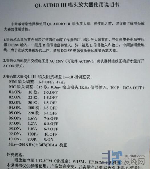 类型:高输出动圈立体声唱头(MC)结构:针尖:日本锥形针尖,寿命>1000小时磁路:LPAUDIO半开式均衡磁路针杆:铝唱头高度:16.5毫米重量:6克电性能:输出电压:1.18mV/33转,1KHz阻抗:120欧姆频率响应:20-20KHz±1DB通道分离度:>25DB左右声道平衡度:<1DB参数:阻抗匹配:47KMM输入或500欧以上MC放大,120-200欧姆MC输入牛推荐针压:2.0克有效针压范围:1.8-2.5克进入状态时间:20小时