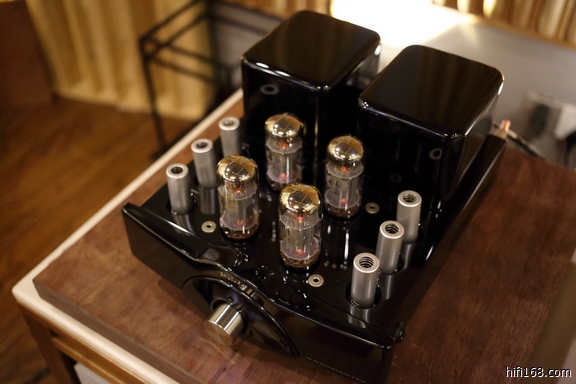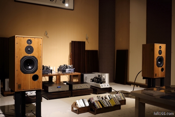 下面来到了上海滩很有名的高伯伯店里,高伯伯主要代理雨后初晴、瑟顿、Manley胆机,一到店里,高伯伯也是很客气的招呼坐下随便听听,现场正在开声播放的是一套瑟顿的CD+小甲类合并机推雨后初晴的超五,这套组合也算公认的优秀搭配之一。现场播放着一段女高音,一位烧友指出高频段有些齿音,高伯伯立刻调整了两侧一次反射点的扩散板果然齿音改善了很多,看来高伯伯这个调声高手不是浪得虚名。我的感觉这套系统分析力要比之前听到的思奔达好,但似乎并没有那套小系统耐听