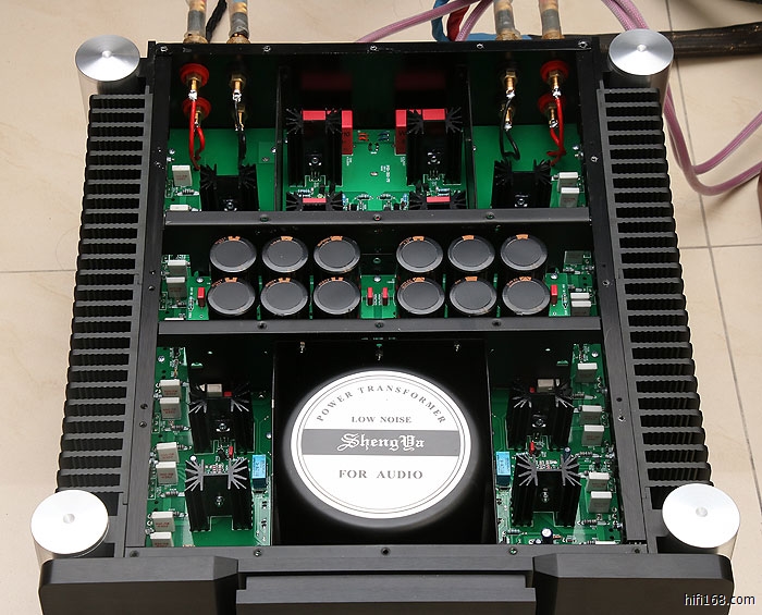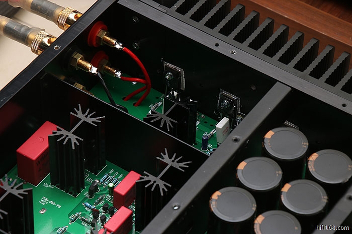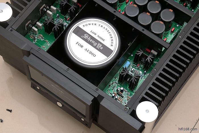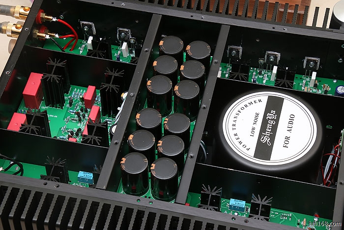 音频信号输入电路由场效应管组成共源共栅差分放大, 晶体管作差分电压放大, 末级由24只大功率三肯晶体管组成强大功率输出级, 可以推动低至2欧阻抗的扬声器。