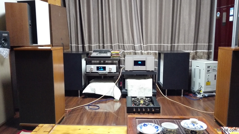 当晚,我与东方蜘蛛群主,论坛难忘的战斗兄,大风兄,群友风轻云淡兄一起为这套前后级先后搭配了ATC SCM7,西湖老款bbsm4,金天朗15寸以及大风兄最喜欢的rogers古董旗舰落地箱PM410,