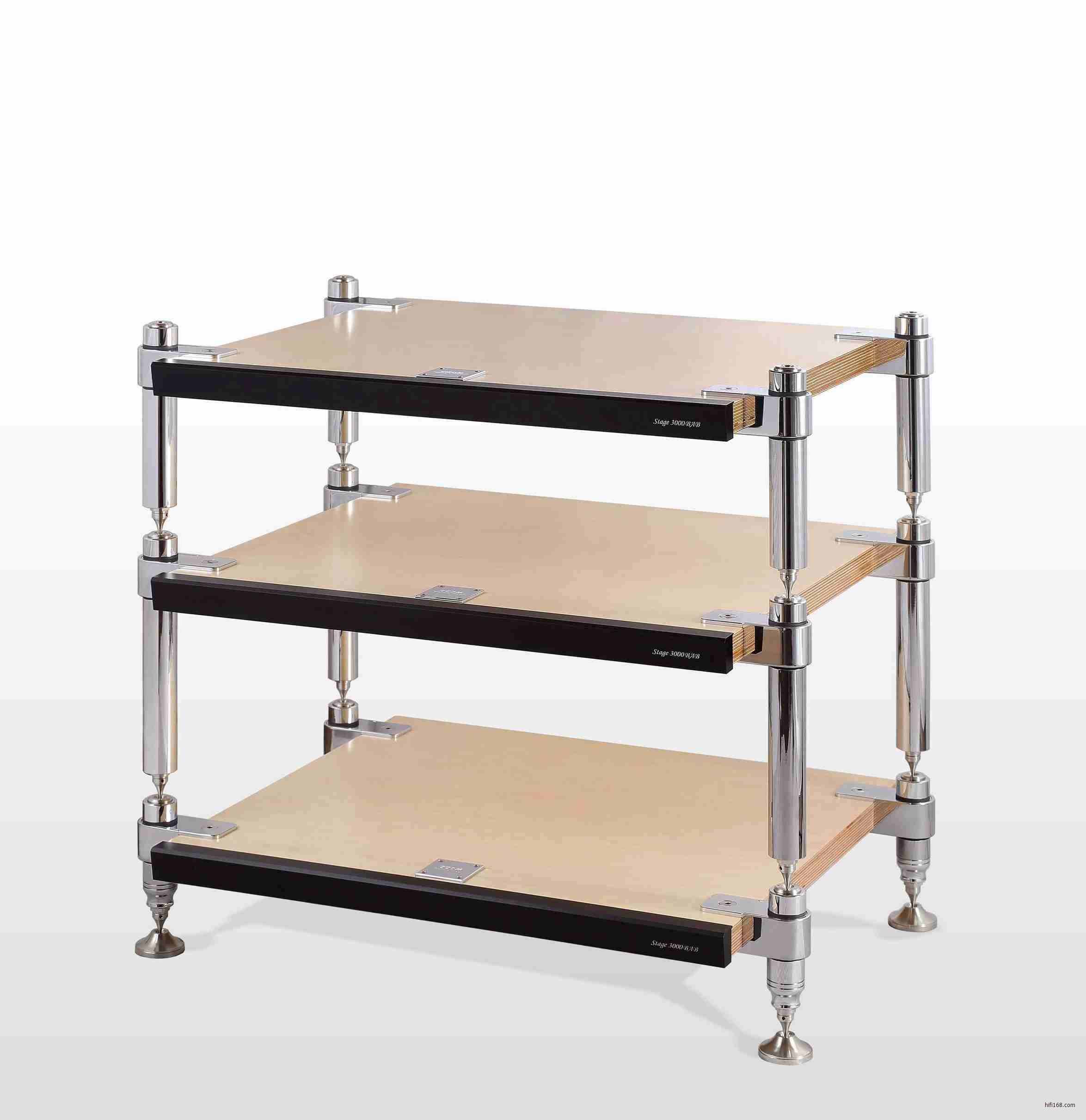而我们现在迎进到国内的是Stage 3000BAB,这是该品牌最顶级的型号。每一层的立柱独立分开,用户可以随意搭配。立柱有黑色和镀锣两种选择,而层板的颜色有桦木本色,黑胡桃,纯黑三种。