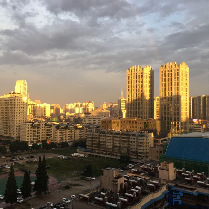 雨后夕阳中一两分钟存在的景色。